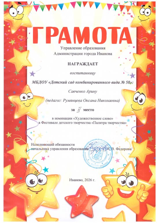 Победитель (2 место) в городском Фестивале детского творчества "Палитра творчества" в номинации "Художественное слово"